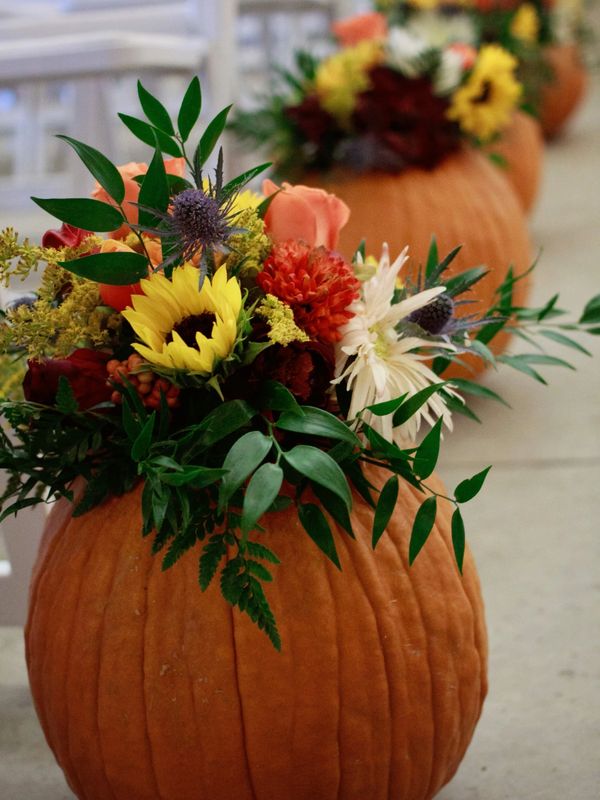 We got married on October 1, 2016, surrounded by over 100 pumpkins. Some pumpkins were filled with gorgeous flowers and others were carved for whimsical candle holders. What I would have given for someone to do all of the heavy lifting for me!